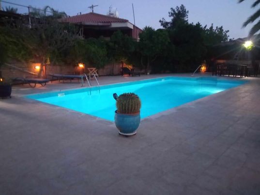 A beautiful five bedroom house is available for rent. Its a spacious property of 485m2 build in 1996 with white facade and blue windows with a living area of approx. 485 m² impresses with its spaciousness of the rooms, its style, the wonderful view and its beautifully arranged large garden park with pool as well as its proximity to the sea. It offers a wonderful view over the mountains harmoniously embedded in the mountains. In the many beautiful indoor and outdoor seating areas you can find sun or shade, relax and unwind. Both the beautiful fitted kitchen in the house as well as a summer kitchen with BBQ invite you to heart-loving to the cooking of the garden-fresh ingredients. Enjoy the outdoors: with a total area of 1554 m², a charming garden with heavenly vegetation surrounded by shaded hiking trails, large outdoor pool, various seating areas, two ponds, large covered bar with small kitchen and BBQ area to linger and stroll , An adjoining building also includes shower, toilet, garage, garage and the heating system, sauna and greenhouse. The generously designed main house impresses with its beautiful ceiling height with open gallery. The uniform living-dining area with fire-place corner, which is kept in a light granite, covers almost 103 m² of the entire ground floor. The kitchen with black granite worktops, counters and all built-in appliances has its own exterior access and access to the large main terrace. A wardrobe and a guest WC round off the room offer on the ground floor. The three terraces are all around it and offer a wonderful view over the ponds and the garden from the dining room. On the 2nd floor are a total of 4 gr. Bedrooms, of which 3 with balcony, 2 bathrooms and a guest toilet. The master bedroom has a large balcony, a large bathroom and a dressing room. On the ground floor there is a guest apartment with integrated kitchenette.